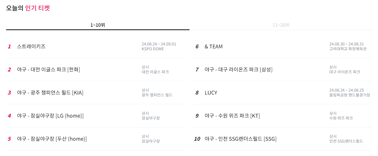 메인화면의 검색창에서 "야구"를 검색하거나, 메인화면의 "오늘의 인기티켓" 중에서 해당 구장을 선택합니다.