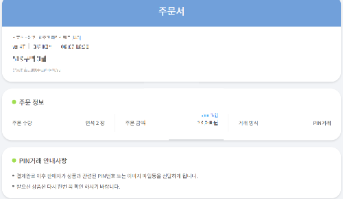 3) 주문서에서 날짜, 좌석, 가격 등을 확인합니다. 안전한 거래를 위해 PIN 거래방식이 많이 사용됩니다. (주의 필요)